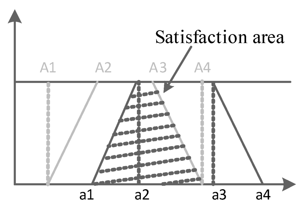 As the value of a goal and the rating value are both represented by trapezoidal fuzzy numbers, the common area [24] can be used as the satisfaction area to measure the satisfaction, as is shown in Figure 4.