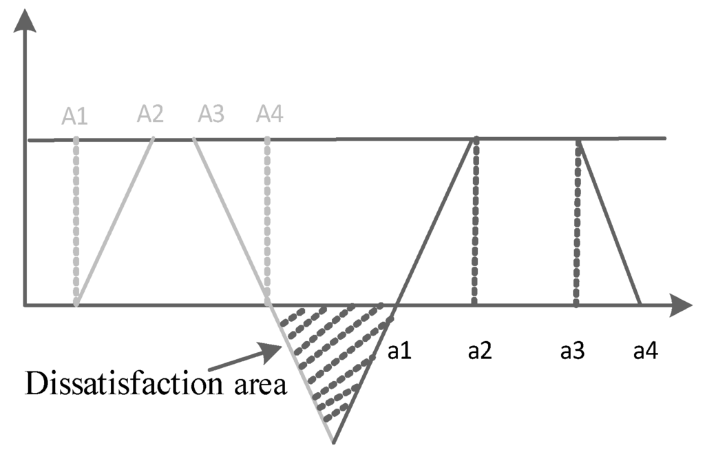 When there are no common areas, the gap area [31] between the system area and design area represents dissatisfactions, and the gap area can be used as a dissatisfaction area, as is shown in Figure 5. The smaller the dissatisfaction area is, the less the dissatisfaction is.