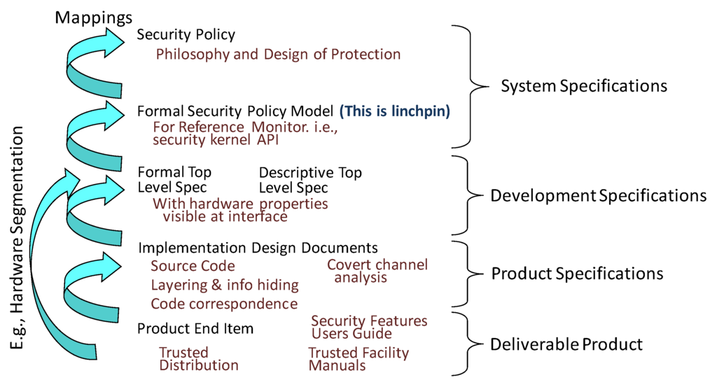 The TCSEC discussion above has noted the important role of mapping from the delivered software in a security kernel all the way up to an abstract access control security policy. The essential elements of the TCSEC secure system engineering mappings are illustrated in Figure 2. This engineering process is especially important to security evaluation, because it provides a critical part of a proof sketch to demonstrate that all of the software in the completed product is a valid interpretation of the kernel API specification derived directly from the “Formal Security Policy Model” discussed earlier.