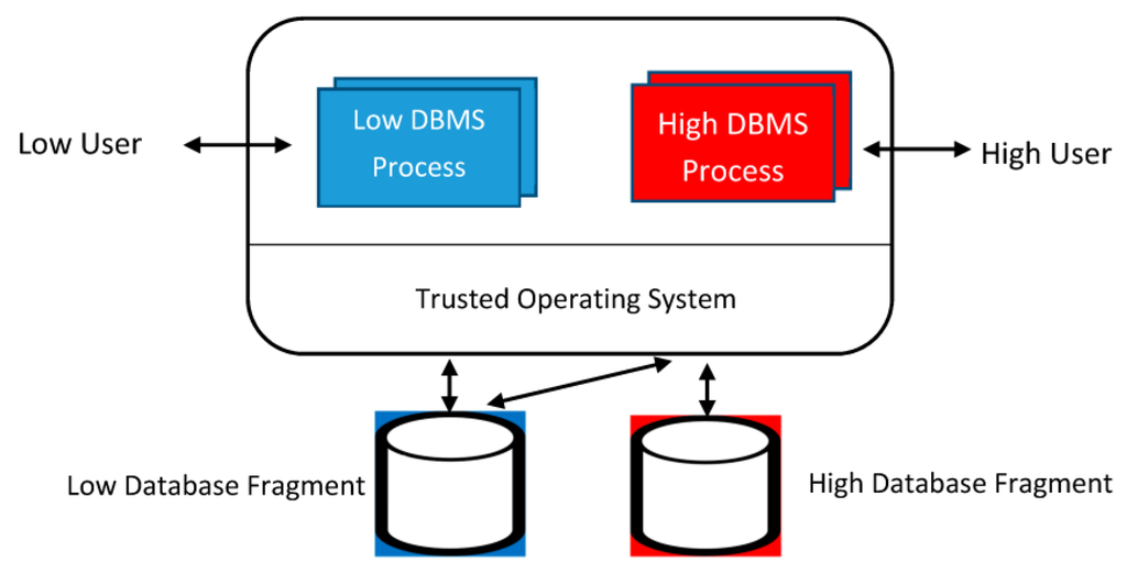 After years of substantial research investment, the accepted conventional wisdom at that time was that a highly secure MLS DBMS was an oxymoron. Then, in the mid-1980s, a research project called SeaView collaborated with Oracle to explore a novel approach to the MLS DBMS problem, applying Reference Monitor based patterns discussed above. The resulting SeaView architecture was successful beyond most expectations. The SeaView architecture is illustrated in Figure 3. The “Trusted Operating System” in the SeaView design was the Class A1 Gemini Multiprocessing Secure Operating System (GEMSOS) product []. The abstract from one of the SeaView project’s published papers summarized the approach: