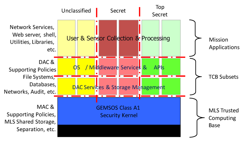 One of the first applications of the GEMSOS security kernel was for an MLS wide-area network called BLACKER, which was successfully evaluated against the Class Al under the Trusted Computer System Evaluation Criteria (TCSEC). In the BLACKER system, the GEMSOS security kernel along with other trusted components, is used as the basis for trust for critical cryptographic and key distribution functions that maintain communications separation by cryptographic means.—National Computer Security Center [] (p. 5)