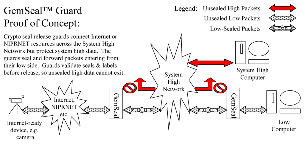 GemSeal Guards use a “crypto seal” to cryptographically bind packets entering the system with the label for their low sensitivity source. The guards forward each labeled packet across the system high network to a guard at its low sensitivity destination. Destination guards validate the label of each packet against the destination sensitivity label before releasing it. A system high packet cannot exit the system because it will not have a crypto seal binding a label to a matching low sensitivity destination label. A paper by the authors [] discusses this architecture in the context of a more general guard architecture that was created using Reference Monitor-based patterns.