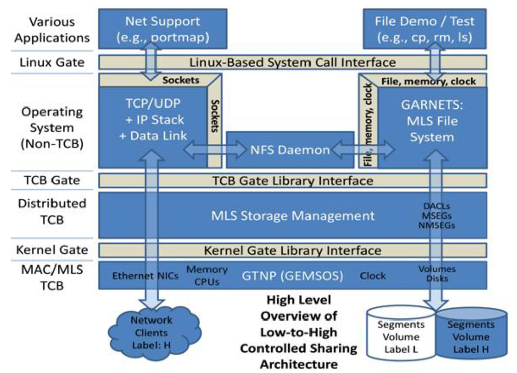 Without the benefit of a security kernel, the current approach to maintaining the security of multi-domain environments is to duplicate the hardware for each domain, which is expensive and which complicates sharing in many applications that depend on it. In contrast, the high assurance file server in this prototype enforces a configurable MAC policy in its support of a controlled access and controlled cross-domain file sharing solution, which can be used for cloud storage []. The MLS file server is designed to support the Network File Service (NFS) file protocol where workstations, servers and applications process information of a single classification level while allowing data sharing between the various levels. The prototype server has separate Network Interface Cards (NICs) for each security domain. No trusted code outside the GEMSOS TCB is required in order to provide low-to-high controlled sharing via MLS read-down from higher domains to lower domain files and directories.