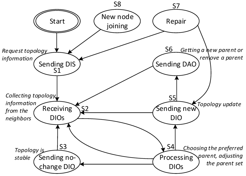 - The five states sending DIS, sending new DIO, sending DAO, repair, and new node joining indicate the instability of the network topology. When the node is in one of these states, the transitions are expected to happen more often, because the DIO trickle time is set to minimum.
