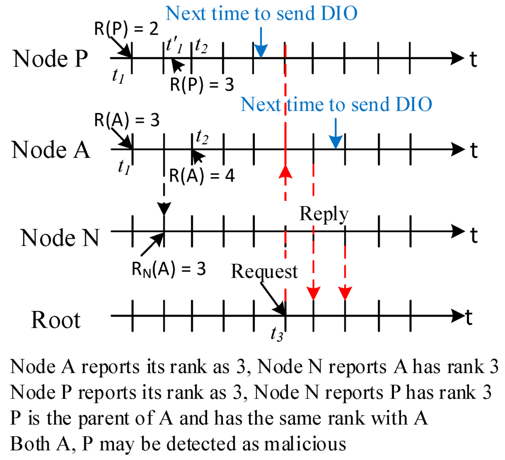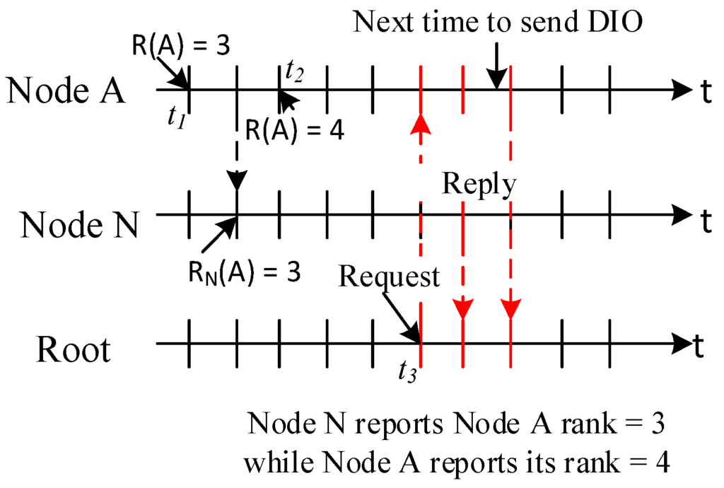 As nodes report information of its neighbors, a cross-check of the collected data is required. However, the cross-check process suffers from the synchronization issue when the IDS agent cannot check whether the data from the neighbor is collected later or sooner than data from the node itself. This issue was first pointed out by Matsunaga et al. [15], through the example illustrated in Figure 4 as follows. Let A is a normal node in the network and N is its neighbor. At time t1 when A broadcasting its DIO, its rank is 3 and N record rank of A as 3 in its memory. At time t2, A updates its rank to 4 but because it is not the time to send the new DIO yet, so A does not send any new DIO, and N still store the rank of A as 3. Soon after t2, at t3, the root requests nodes to send IDS information. In this case, node A will send its rank as 4 (its current rank) while node N informs the root that the actual rank of A is 3. The rank information of node A that it and node N reported is not the same because the recording time was not synchronized. This synchronization issue makes the root consider that the rank of A is not consistent, hence detect A as malicious node, which create a false detection.