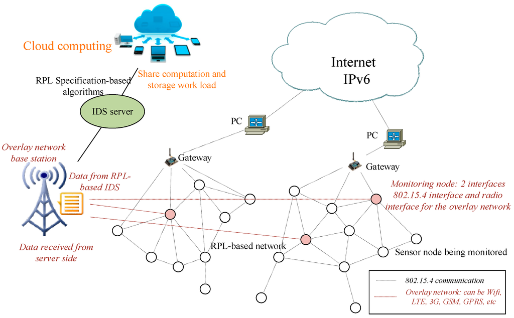 To enable the use of a more robust anomaly-based IDS working on a larger amount of monitoring data, we envisage an architecture that can extend the computation and storage capability of the IDS massively, yet still keep the network overhead low and acceptable for operating. In detail, we extend the cluster monitoring architecture by first making benefit from the multiple-interface design that allows the sensor devices to communicate in different channels. One real life example is the Libelium Waspmote devices that allow many wireless communication standards such as Wifi, 3G, GSM, GPRS, LoRa, and so on apart from sensor data transmission [16]. We can use the multi-interface sensor devices as the cluster heads to communicate both in RPL-based network and another overlay network, which supports high speed, long distance, and low power consumption transmission. There are many options for such overlay network, for example, the IEEE 802.11, LTE, 3G, etc. By doing so, we aim at transferring the IDS monitoring data directly to an IDS server through the overlay network by the extra interface. To compare with the network-based architecture, sending IDS data to the server through the overlay channel will eliminate many communicational issues such as overhead, delay, packet loss, etc. Moreover, we propose to implement the Cloud Computing [17] application at the IDS server. The IDS work deal by the server only before now can be delegated to many other computers in the Cloud, which helps to enable the IDS computation and storage capability massively. The additional cost for implementing this architecture is only a little, given the reasonable price of multi-interface cluster heads, IDS data collection, and Cloud Computing service. The benefit of this architecture will be the allowance to use many robust IDS algorithms on large amounts of IDS data, so as to have higher accuracy in dealing with many other internal threats effectively, while can be scalable well in large-scale network. An illustration of this vision can be seen in Figure 7 below.