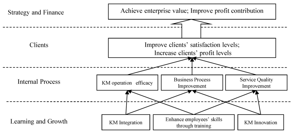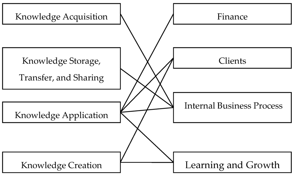 KM can be considered as a collection of processes including knowledge acquisition, sharing and transfer, application, and creation []. The purpose of KM is to maximize the value creation for an organization through consolidating its client and human capitals. Therefore, the KM performance evaluation framework should be aligned to the objectives of enterprise KM to help organizations maximize the benefits of their KM initiatives. Since BSC incorporates finance, clients, internal business processes, and learning and growth and an enterprise’s value creation can be reflected through these four aspects, we believe that the mapping between KM and BSC can be established as shown in Figure 1.