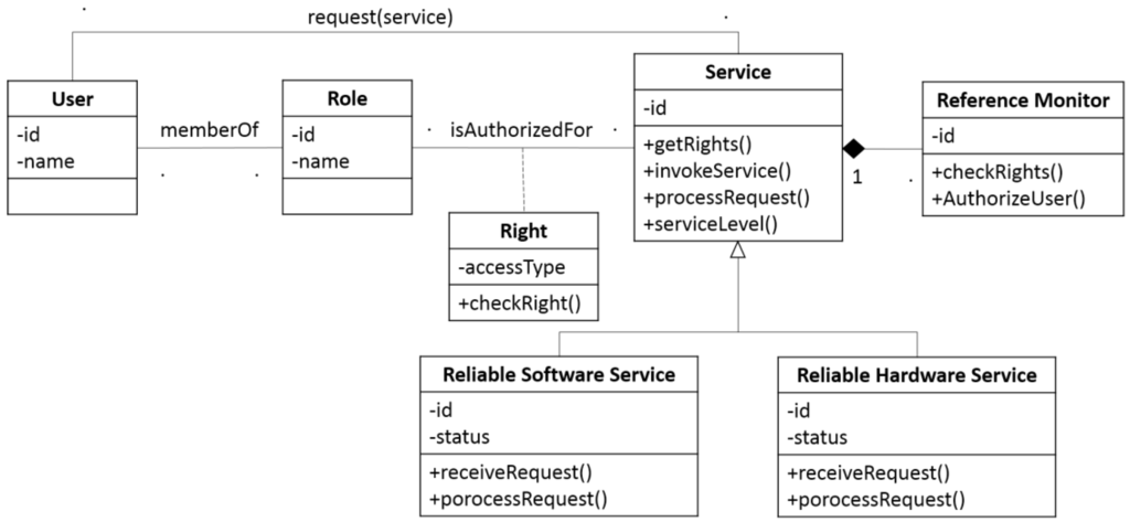 - Client (c)—the entity that needs to select or integrate a remote service based on its reliability and security requirements. Here, the Client is a user who would be authorized by the reference monitor defense depicted in Figure 20.