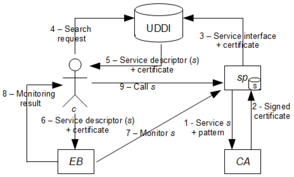 - Evaluation Body (EB)—an independent, trusted component carrying out monitoring activities. EB is trusted by both c and sp to correctly check the certificate validity on the basis of the monitoring rules and metrics.