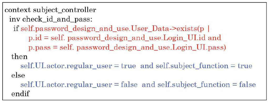 A security design pattern is a reusable documented security problem and corresponding solution that can be used to make decisions on the conceptual architecture and detailed design of a software system. In the design phase of software development, security functions should be designed to satisfy the security properties of the assets identified in the requirement phase. Security design patterns include “Name”, “Context”, “Problem”, “Solution”, “Structure”, “Consequence”, and “See Also”. The “Structure” usually contains some design models described by the Unified Modeling Language (UML). UML is a widely accepted and standardized language to model software applications [4]. These models may contain constraints on the design in the form of OCL descriptions. OCL [5,6] stands for Object Constraint Language, which is a semiformal language that is used to express constraints and other expressions in UML and other modeling languages. For example, in [7], we successfully defined UML models with OCL descriptions for various security design patterns.