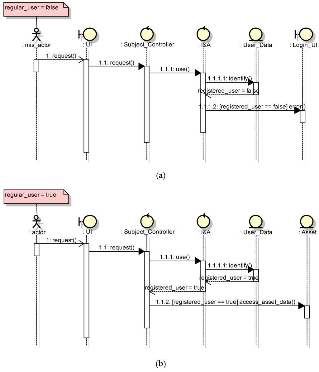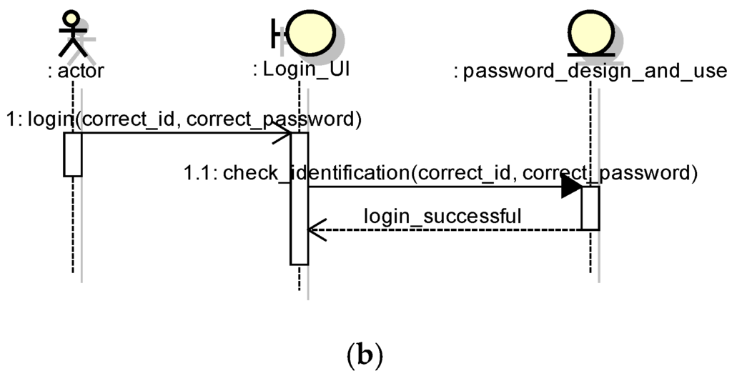 Behavior to access an asset (Password Design and Use pattern). (a) Failure case; (b) Success case.