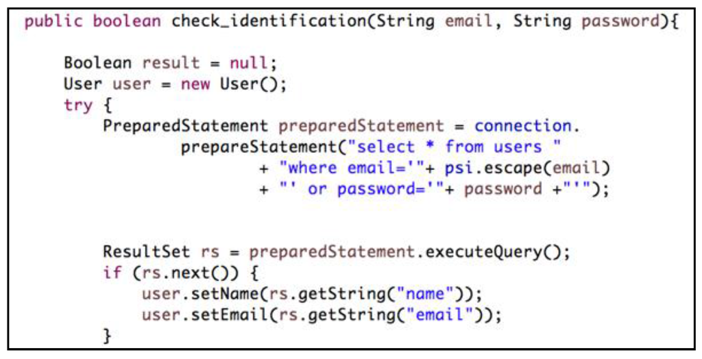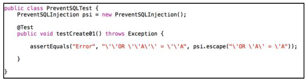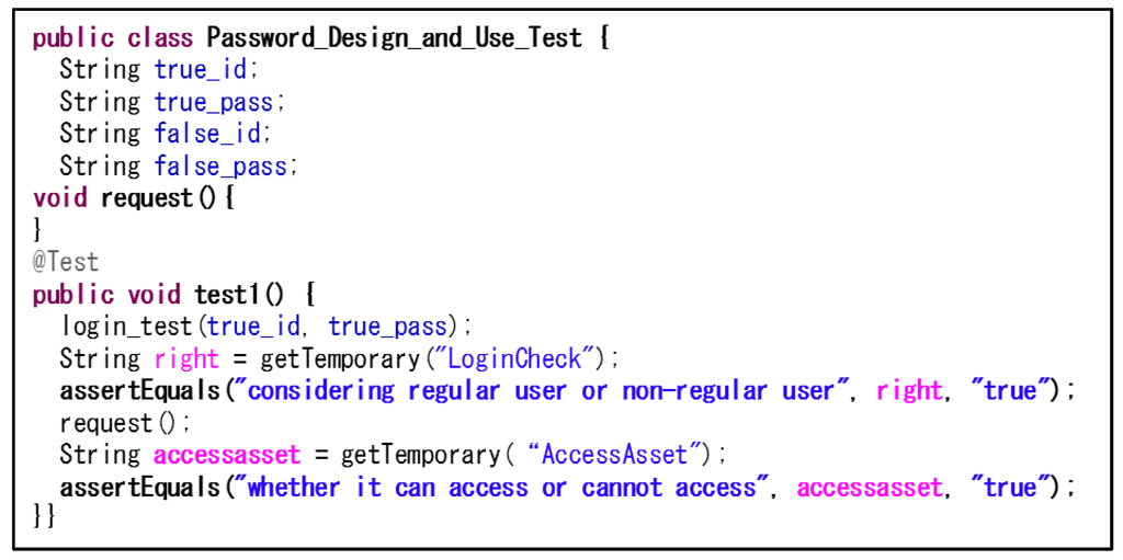Although the class diagram in Figure 5 appropriately applies the Password Design and Use pattern and the Prevent SQL Injection pattern [3], it is incomprehensible in the implementation phase. How to implement the selected pattern is unclear because the relation between the security design pattern and implementation is not defined. Figure 6 shows part of the implementation of the diagram in Figure 5 with defects, which are a miswritten SQL description and an omitted escape process. Consequently, the system may be vulnerable. Thus, the applied pattern must be verified via a test in the implementation phase.