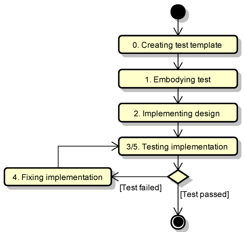 - Test and validate the applied patterns.Based on TDD, a test is quickly executed to validate the applied patterns in the implementation phase. During this step, concrete test aspects generated from aspect test templates are weaved into the implementation under testing for the instrumentation purpose.