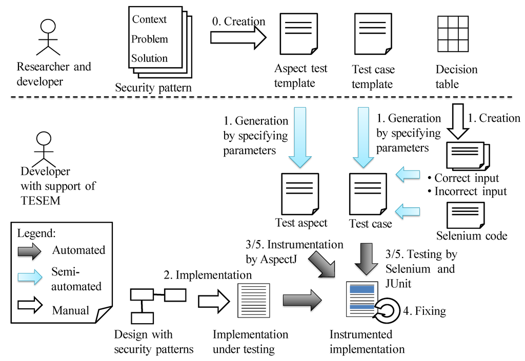 Our method verifies the applications of security design patterns and supports their implementation. Figure 7 outlines the process of our method. A test template is derived from a security design pattern by providing design information. Then the developer executes a test to validate the applied security design pattern in the implementation phase of software development. Figure 8 shows the entire picture of our method that clarifies necessary inputs and outputs by using our method’s implementation tool, called TESEM (TEst driven SEcure Modeling tool). The developer can create a test case by inputting correct input data, incorrect input data, and the testing environment Selenium code into TESEM. Our tool allows a developer who is not a security specialist to create the test case.