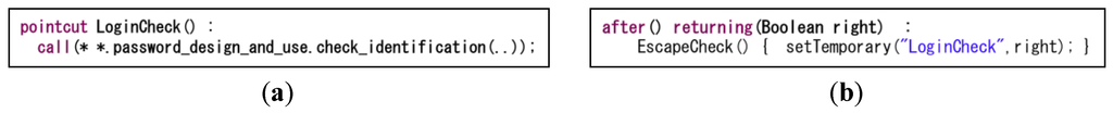 In our method, a test template, which is created via AspectJ, embodies the test, observes the internal processing, and supports vulnerability validation. Because the internal processing does not display the result on the screen such as escape processing in Figure 3, it is hard to validate that the processing is executed and the result is correct using browser-based testing.