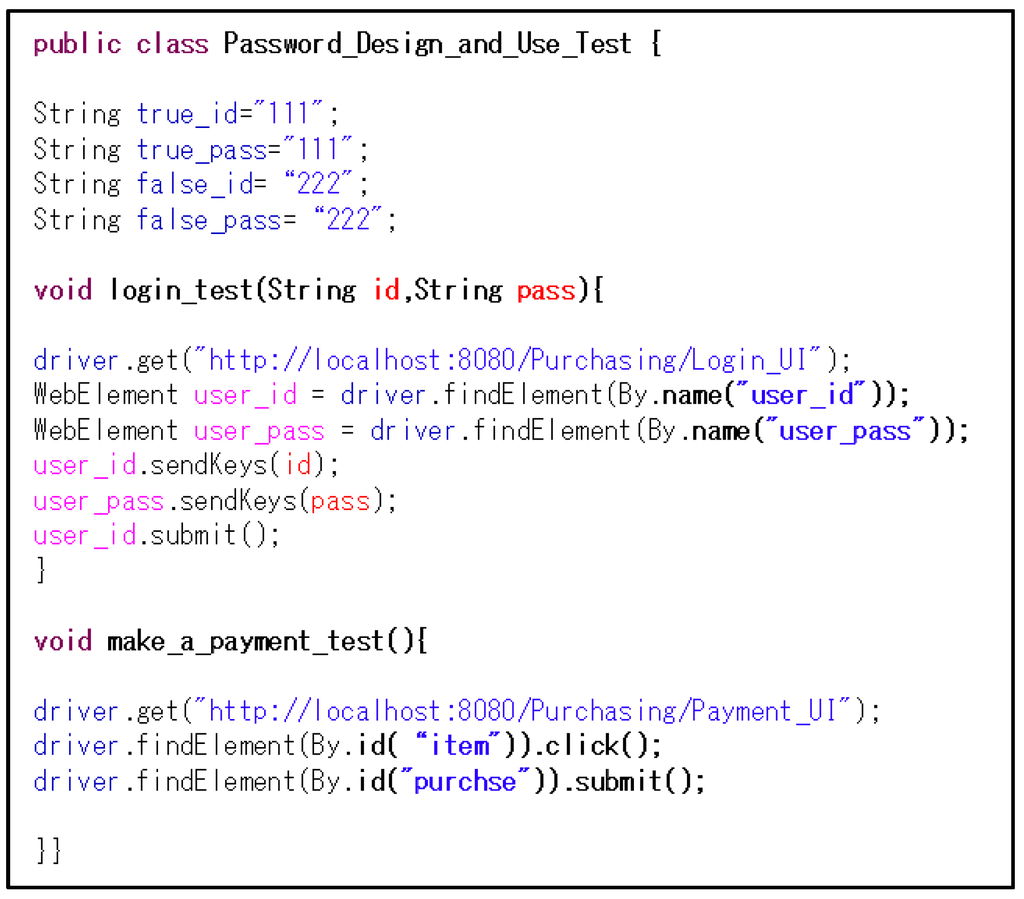 Figure 18 and Figure 19 show the test case developed by Student 1. Figure 18 is the test case, which was rewritten for every test. Because the test case could not be reused, whether the test results are correct cannot be confirmed. In contrast, the test case shown in Figure 19 can be reused, allowing the accuracy of the result to be confirmed. Students 2 and 4 created test cases similar to Figure 18 (Figure 19) when using the existing (our) method. Using our method, all students were able to run a regression test. From these results, we conclude that our method can develop a regression test.