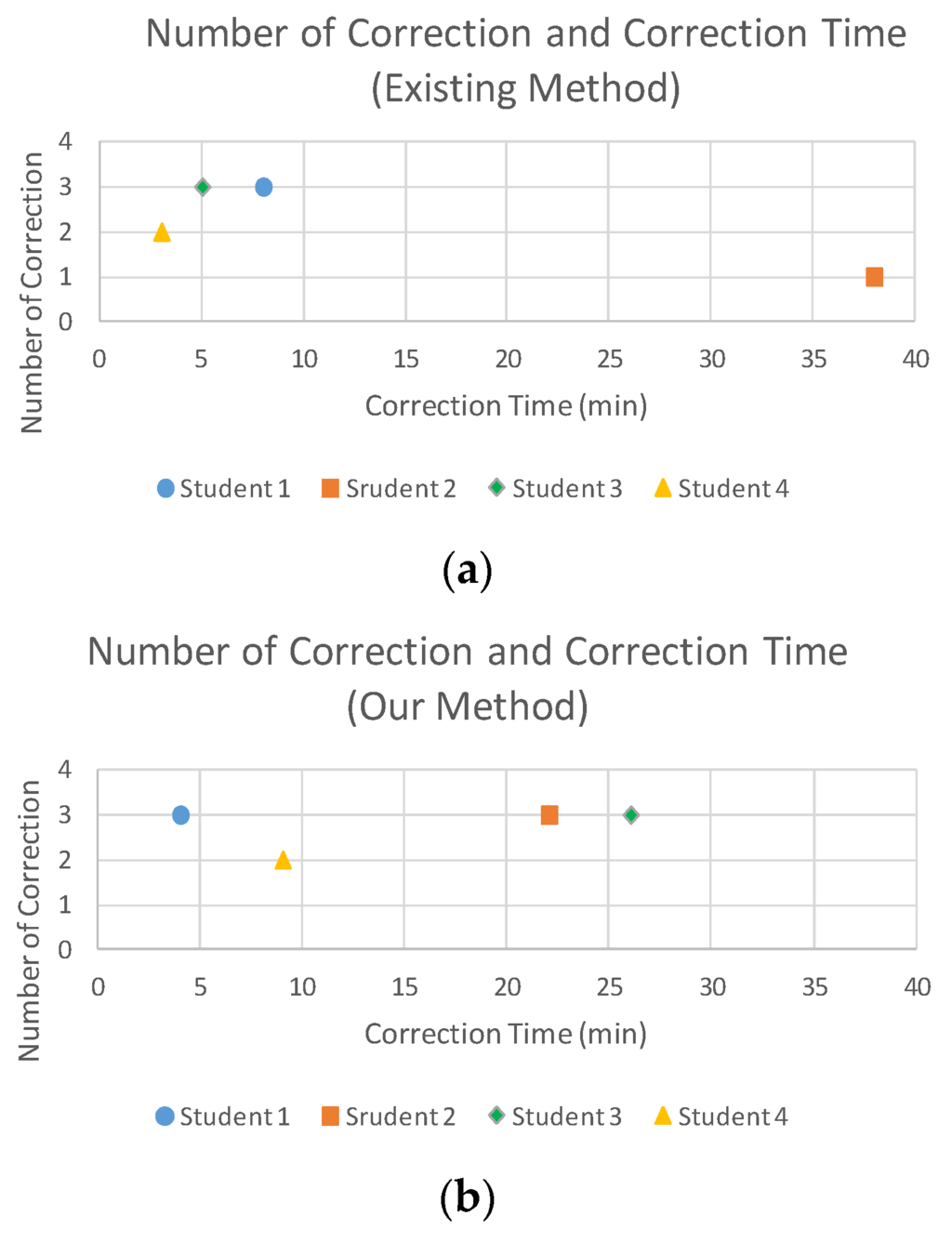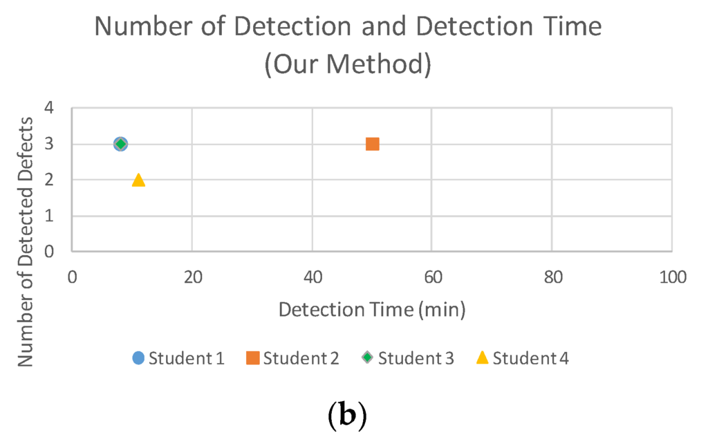 Figure 16 and Figure 17 show scatter plots of the results for each student. Using our method, the detection time decreased for all students. In addition, Student 2 detected more defects, whereas Students 1, 3, and 4 detected the same number of defects using both methods. As for the correction time, the second method (i.e., our method for students 1 and 2, and the existing method for students 3 and 4) required less time regardless of which method was used.