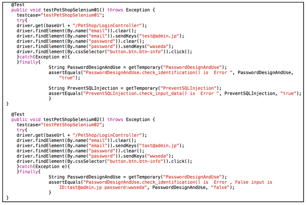 On the other hand, our method focuses on security design pattern applications. Our method uses Selenium [23,24] and JUnit [25,26], which are tools for testing applications. First a test is created where the security requirement of the corresponding pattern is satisfied. Then a test is quickly executed (first test) to detect vulnerabilities in the code. Afterwards the code is updated so that it passes the test. Finally the test is re-executed to confirm that the vulnerabilities are resolved.