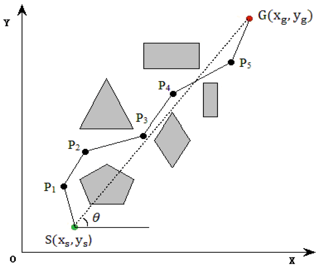 In Figure 2, the line segment SG from the starting point to goal point is equally divided into d +1 segments (such as d = 9 in the Figure 2). Drawing lines perpendicular to the axis through each division point, we pick any one of the points on each line from the starting point to the goal point to form a set of path points in order. Due to the path points on the vertical coordinate being equidistant, the vector formed by the horizontal ordinate of the path points (i.e., Pi) can express one workable path. Because the coordinates of starting point and goal point are known, the above path can be simplified as . Therefore, the path planning problem can be converted into searching the horizontal ordinate xi of a path point on each equidistant line, which ensures that the path connecting the points in sequence is shortest with avoiding obstacles.