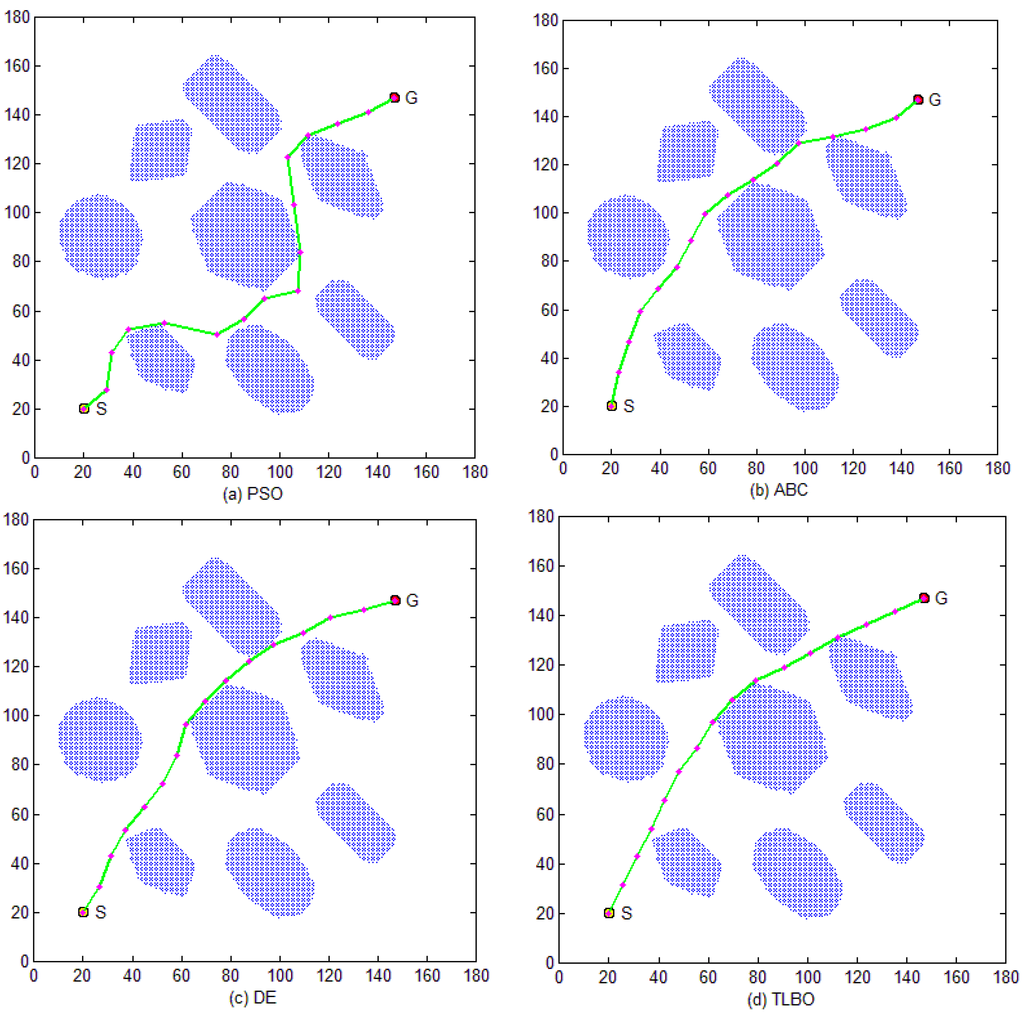 In this experiment, the size of the movement environment map of the mobile robot is 180 × 180 pixels, the coordinates of start point and goal point are (20, 20) and (147, 147), respectively. To be fair, the standard particle swarm optimization (PSO) algorithm, artificial bee colony (ABC) algorithm, differential evolution (DE) algorithm, the basic TLBO algorithm, and the proposed NIWTLBO algorithm are simulated in the same environment. That is, in all algorithms, the number of learners (i.e., NP) is set to 20, the number of subject dimensions (i.e., D) is set to 14, and the max number of iterations (i.e., MAXITER) is set to 200. In the PSO, C1 = C2 = 2.0, Inertia weight w = 0.9; for the ABC there are no such other specific parameters to set; in the DE, F is a real constant which affects the differential variation between two Solutions and R is crossover rate. Set F = 0.5, R = 0.4; for the TLBO and NIWTLBO, there are no parameters to set either. The results of all algorithms, in the form of mean solution and standard deviation, are obtained in 30 independent runs on the path fitness function. The comparative results of the path length are recorded in Table 1. The optimal path maps of each algorithm are shown as Figure 3. The Figure 4 shows the optimal convergence graph for all algorithms.