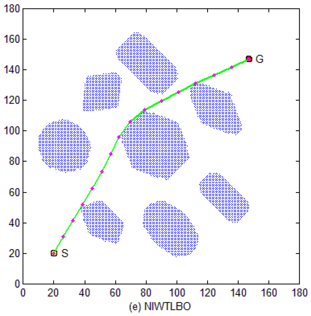 In order to gain more insight about the usefulness of the proposed method, the different scenarios of the path planning are used in our experiments. We use several scenarios in the path planning dataset [23] which is the repository at the Czech Technical University to prove the ability of path planning. The motion planning maps are resized to 180 × 180 pixels. In order to simplify the processing, we do not rotate the coordinate of the maps in these experiments. For the start point and the goal point , the difference is equally divided into D + 1 segments. Drawing the lines paralleling to the x-axis through each division point, we can get the coordinate of each path point, which is a constant value. Thereby, the optimization method is the same as the original. We only need to select the on each parallel line for optimization. This method is more suitable for the motion planning maps expressed by the images. In the experiments, the number of learners (i.e., NP) is set to 25, and the max number of iterations (i.e., MAXITER) is set to 300. The NIWTLBO and the basic TLBO algorithms are executed 10 times in each motion planning map, respectively. The best results of every scenario for the algorithms are shown in Figure 5, Figure 6, Figure 7 and Figure 8.