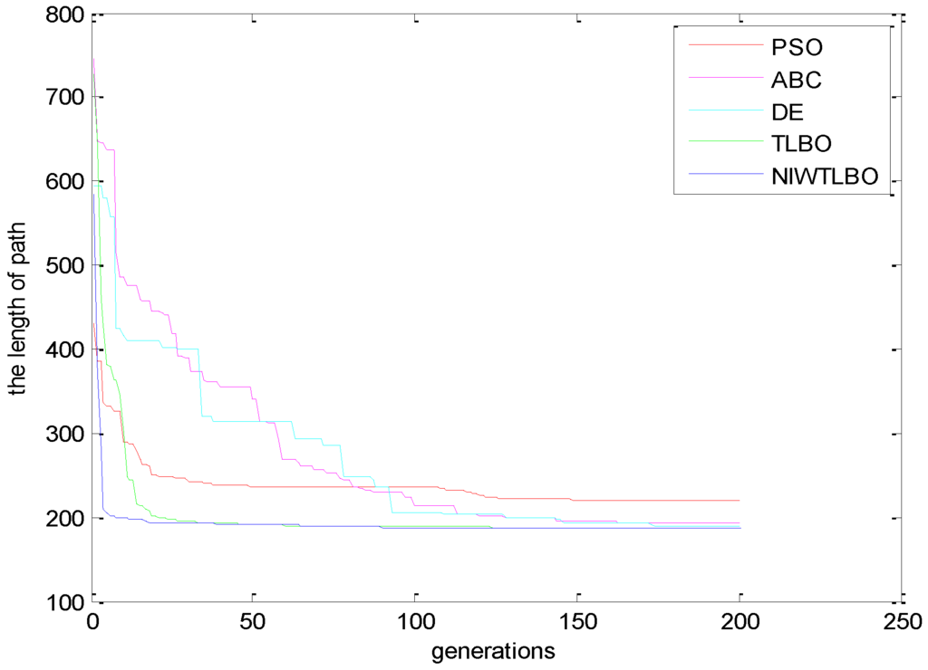 It is observed from the results in Table 1 and Figure 3 that the path of PSO is the worst, and the paths of TLBO and NIWTLBO are better. The convergence rate of the PSO, TLBO and NIWTLBO is faster. At the same time, the NIWTLBO can improve the search accuracy and achieve the optimal path ideally. The PSO has a poor local search ability because it could not find the better path after some certain generations. The particles so easily veer from the feasible region to the infeasible region in the search process in the PSO algorithm, which leads to large number particles changing their optimal search direction after the constraint processing. So the final result is unsatisfactory. The convergence rate of the ABC is slower, and it easily becomes trapped in a local optimal solution due to its poor ability of exploration. The DE algorithm is similar to the ABC. The ABC and the DE algorithms may achieve ideal path after over 2000 generations, which need more run time. However, the NIWTLBO algorithm can obtain the better optimal path after fewer generations. From Figure 4, we can see clearly that the NIWTLBO algorithm had the fastest convergence rate and performs better than the basic TLBO, PSO, ABC and DE algorithms.