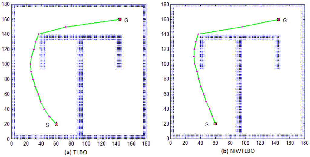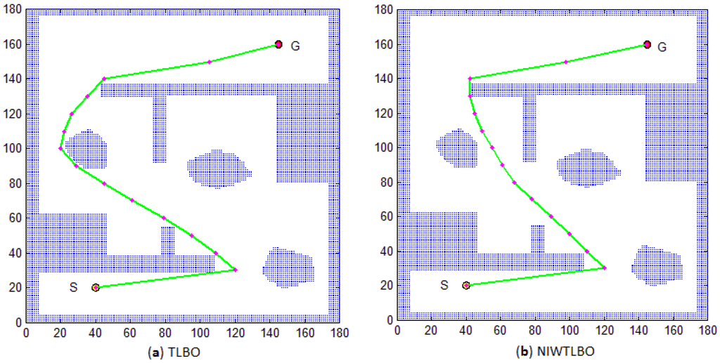 In recent years, the teaching-learning-based optimization (TLBO) algorithm has been proposed by Rao et al. [12,13]. This algorithm is very suitable to solve the path optimization problem due to its fast convergence speed and high precision. Therefore, it provides a new solution for the mobile robot’s global path planning. The TLBO requires only the common control parameters like population size and number of generations and does not require any algorithm-specific control parameters. It is an algorithm-specific parameter-less algorithm [14]. So, in the TLBO algorithm, there is no burden of tuning control parameters. Hence, the TLBO algorithm is simpler, more effective and involves relatively less computational cost. Therefore, the TLBO has been successfully applied in diverse optimization fields such as task scheduling, production planning and control, mechanical engineering, vehicle-routing problems in transportation, etc. Recently, several variants of the TLBO have been proposed to improve the performance. Rao et al. presented an elitist TLBO (ETLBO) algorithm [14] to solve complex constrained optimization problems, and used a modified version of TLBO algorithm [15] to solve the multi-objective optimization problem of heat exchangers. Furthermore, some modified TLBO algorithms have been proposed to solve the global function optimization problem [16,17,18,19] and the multi-objective optimization problem [15,20,21]. However, so far, applying the TLBO algorithm to solve the optimization problem for the mobile robot’s global path planning has not been reported in the literature. In our recent work, we have proposed a novel improved TLBO, which is called Nonlinear Inertia Weighted TLBO (NIWTLBO) [22]. In this paper, we apply this NIWTLBO algorithm to solve the optimization problem for the mobile robot’s global path planning.