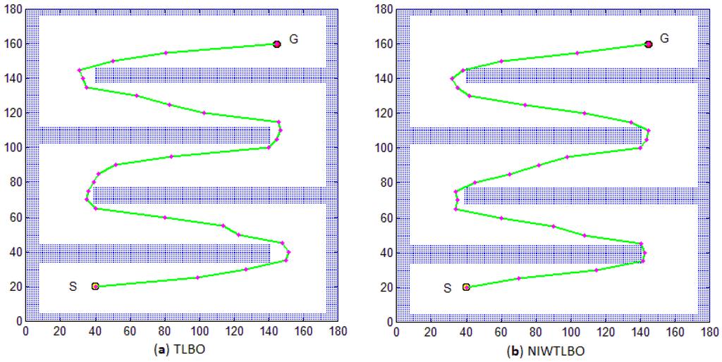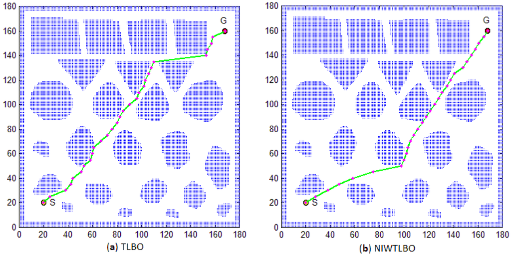 After 10 experiments for each motion planning map, we have achieved the optimal path. From Figure 5 to Figure 8, we can observe that the NIWTLBO method performs better than the basic TLBO on the path planning. Due to the weak ability of exploration and escaping from the local optima, the path obtained by the basic TLBO is not the shortest. The NIWTLBO method improves the population diversity with higher probability of stochastic variations, and it is not easy to trap into the local optima. Therefore, it can achieve the better results.