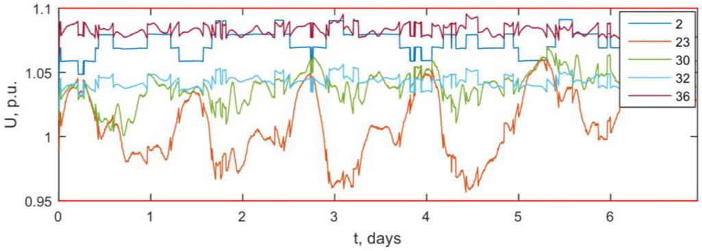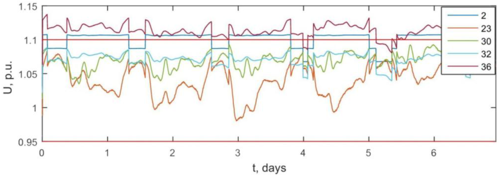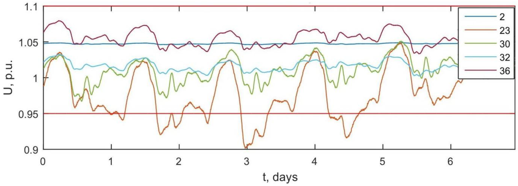Figure 4 shows voltage profiles in the network with SSVC. In this case, voltage regulation is based on the described approach.
