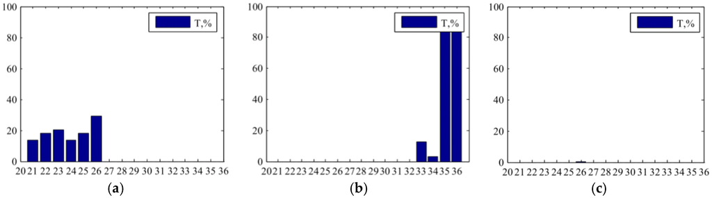 Relative time of the output voltage limit exceeded with different regulation methods. (a) Voltage stabilizing; (b) opposite voltage regulation; (c) grid with SSVC.