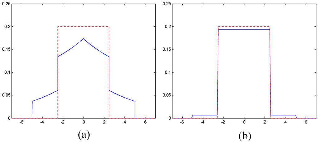 Probability density functions of: (a) the quantization distortion in HL, LH, and HH subbands (, ); and (b) the quantization distortion in the LL subband (, ). The dashed lines represent the commonly assumed uniform distribution.