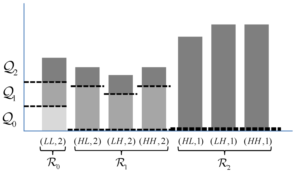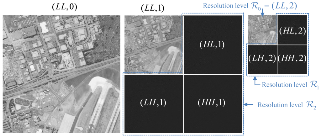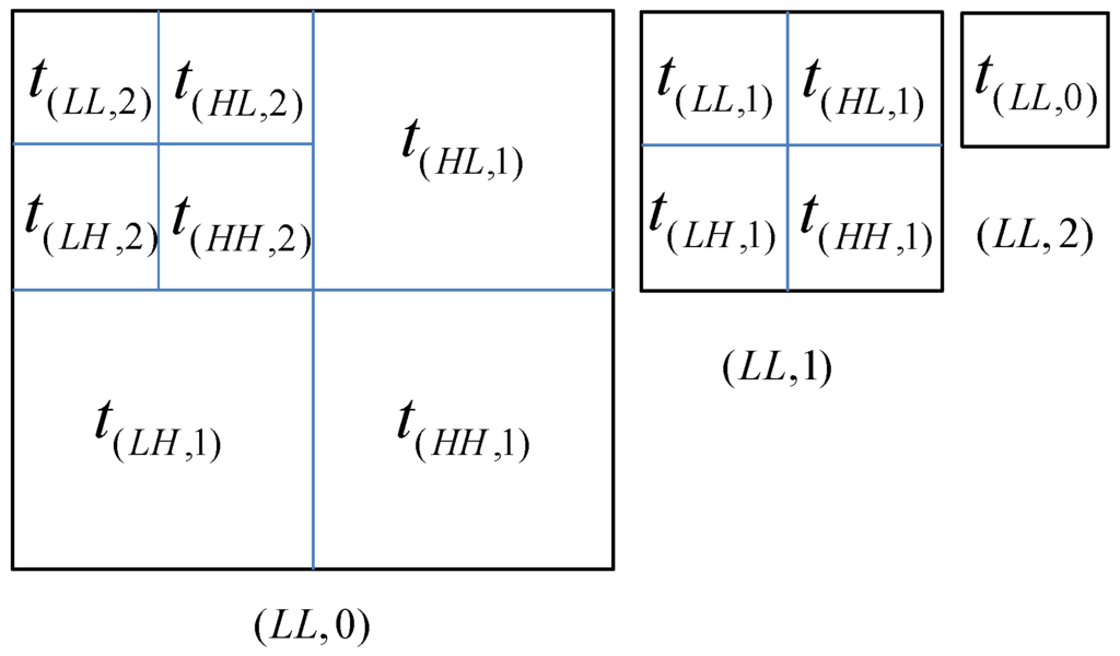 JPEG 2000, with K levels of dyadic tree-structured wavelet transform, inherently supports the synthesis of different resolution images. As shown in Figure 2, the lowest resolution level corresponds to the lowest resolution image . The next lowest resolution level together with can be used to render the next to lowest resolution image . Continuing in this fashion, resolution level together with the image can be used to synthesize the image , for , with the full resolution image denoted by .