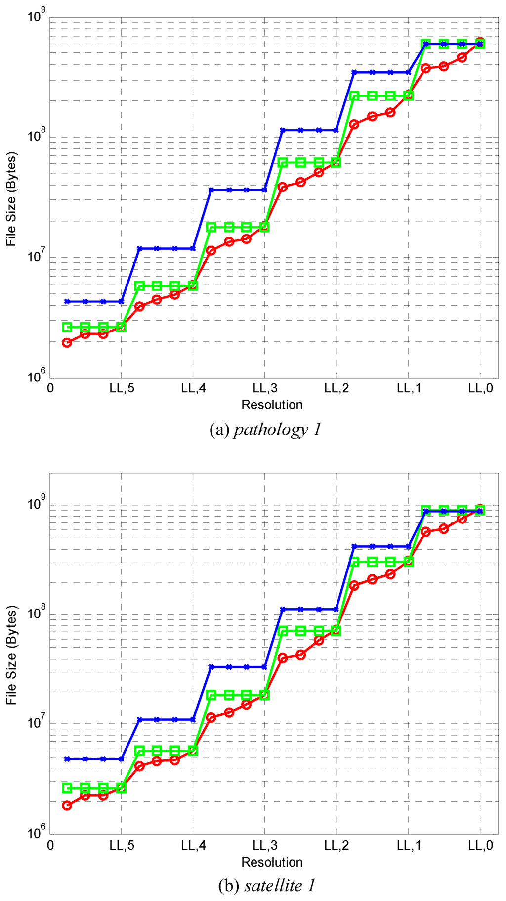 Number of bytes required for decompression by the three described coding methods for the two images (a) pathology 1 and (b) satellite 1. The single-layer, six-layer, and 24-layer methods at each resolution are denoted by crosses, rectangles, and circles, respectively.