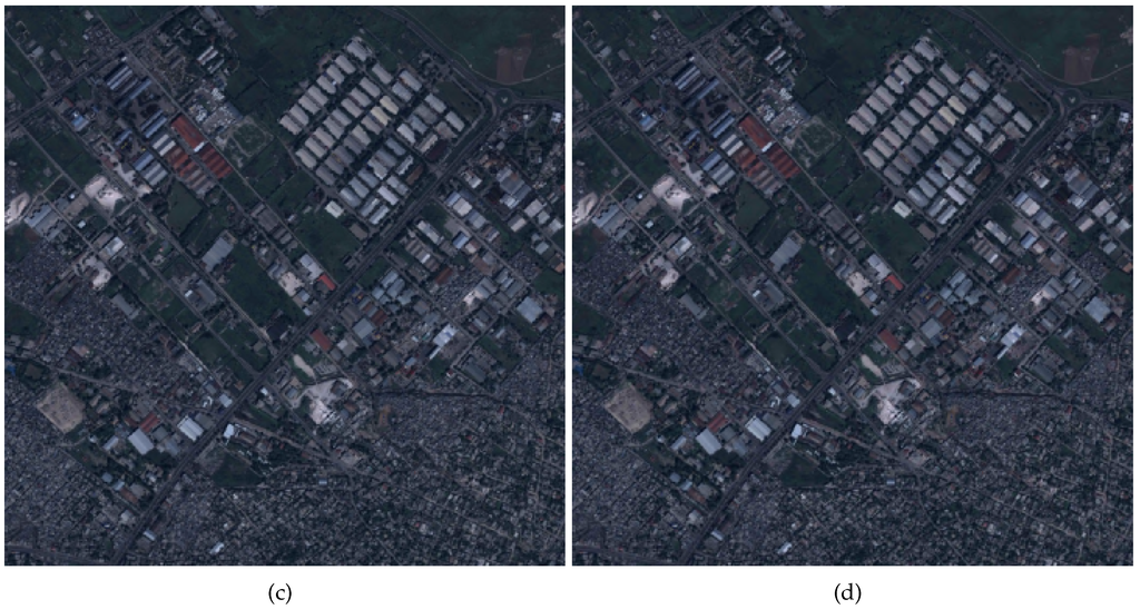 Satellite 2 image rendered at resolution . (a) reference; (b) single-layer method; (c) six-layer method; and (d) 24-layer method. The images are cropped to after rendering to avoid rescaling during display. The images should be viewed with PDF viewer scaling set to 100%. Satellite image courtesy of GeoEye (DigitalGlobe, Westminster, CO, USA).