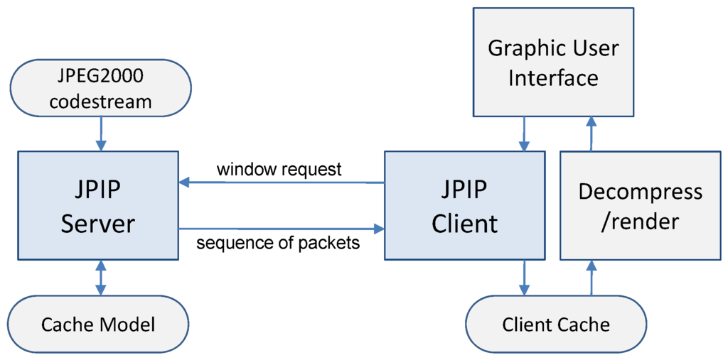 Figure 7 shows a block diagram of a JPIP remote image browsing system. First, the client requests the spatial region, resolution, number of layers, and image components of interest using a simple descriptive syntax to the server. In response to the client request, the server accesses the relevant packets from the JPEG 2000 codestream and sends them to the client. The client decodes the received packets and renders the image. Through a graphic user interface (GUI) on the client-side, a user can request different regions, resolutions, components, and number of layers at any time. To minimize the number of transmitted packets and maximize the responsiveness of interactive image browsing, the server assumes that the client employs a cache to hold data from previous requests, and maintains a cache model to keep track of the client cache. If a request is found to contain cached data, the server does not re-send that portion of the data.