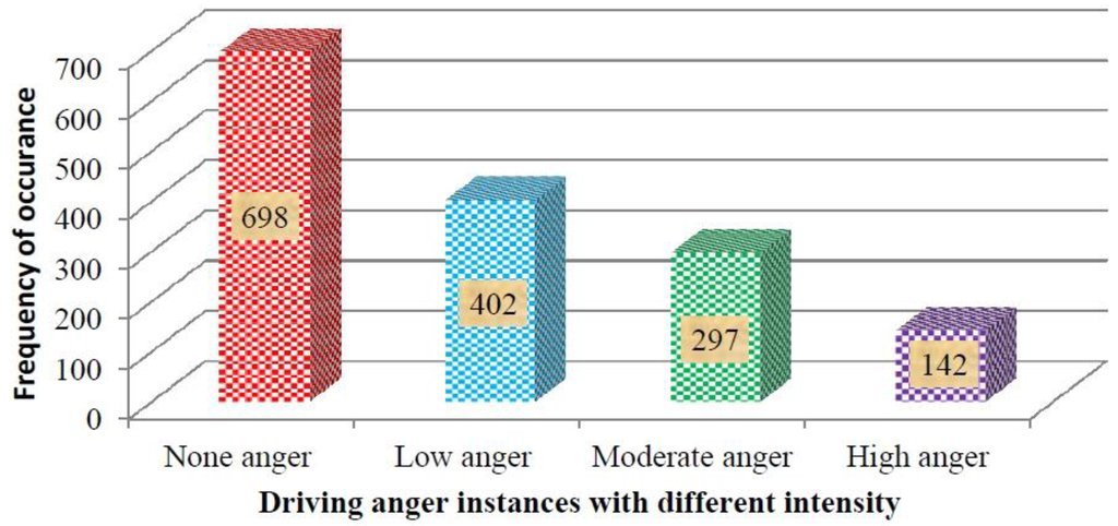 According to evaluation about the subjects’ emotion state during the experiments from both the subject and the observer, anger emotion was indeed induced by the elicitation events. In order to study EEG spectral features under different driving anger states, it is necessary to label different anger intensity in terms of the anger levels self-reported by all subjects. In this study, the subject’s self-report levels will be adopted if evaluation difference of emotion levels between the subject and the observer is less than 2. Otherwise, a more experienced driver will be employed to evaluate the subject’s emotion level based on the video replay captured by Monitor video camera system. Then, driving anger states were divided into 4 categories including none anger state (anger level < 1), low anger state (1 ≤ anger level < 3), moderate anger state (3 ≤ anger level < 5) and high anger state (anger level ≥ 5). Hence, 841 anger-related instances and 698 neutral (considered to be none anger) instances, were obtained to be analyzed for this study. The number distribution of the anger relevant instances is shown in Figure 3. Furthermore, that a great number of medium and high anger emotion were induced, verifies that the anger induction method proposed in this study is viable.