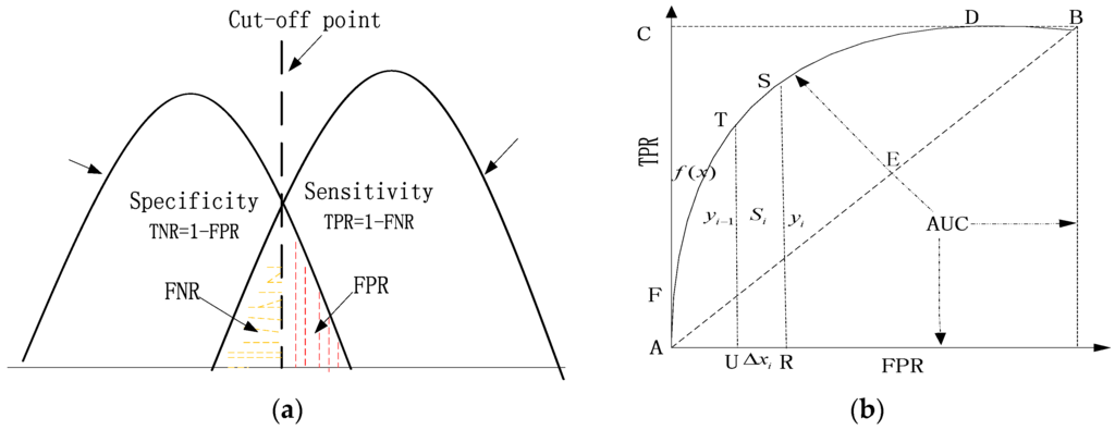 where, and are the upper and lower bound of horizontal ordinate (FPR), respectively; is area of the th curved trapezoid in coordinate system for ROC curve, as shown in Figure 5b; and are the length of upper base and the length of lower base of the th curved trapezoid, respectively; is height of the th curved trapezoid.