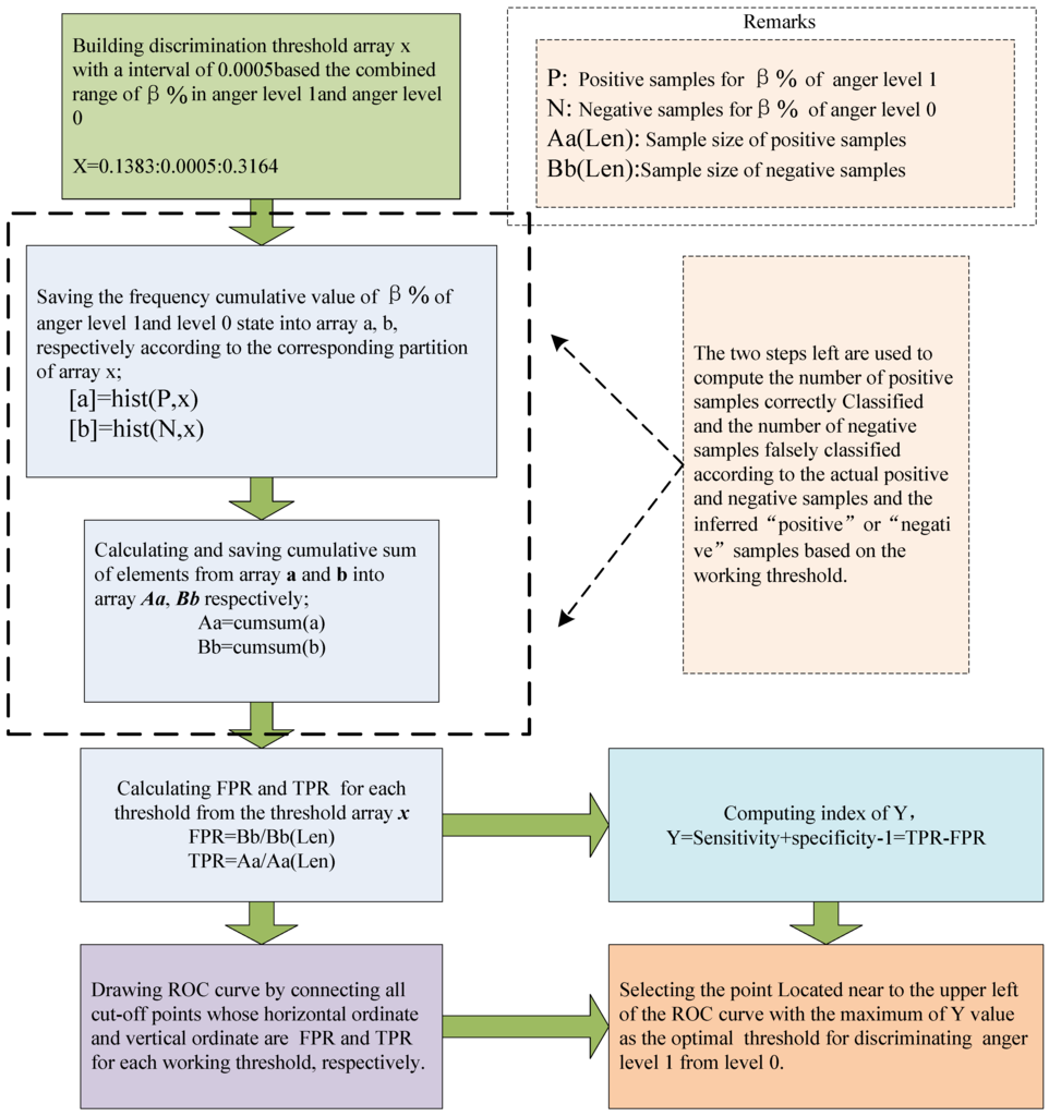 Analysis method of receiver operating characteristic (ROC) curve originated from electrical signal detection theory and now has been widely used in fields of medical diagnosis, human decision-making, industrial quality control, military monitoring and so on [31,32,33,34]. It is a quantitative approach for accurate decision or judgment for two confused state by determining the best discriminant threshold. Therefore, it was hypothesized that ROC curve analysis method would be suitable for examining the relationship between EEG features and the presence or absence of driving anger state with a specific intensity. Here, the optimal thresholds of driving anger states with different intensity based on θ% and β% will be determined by ROC curve analysis. According to [31,32,33,34], three important principles of ROC curve analysis method for determining driving anger states are listed as follows.