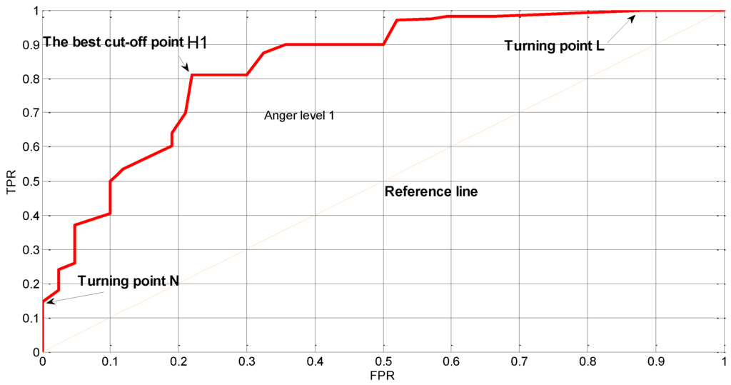 According to the drawing process introduced in Section 4.2, the ROC curve of the relative energy spectrum (β%) at anger level 1 is shown in Figure 7. The vertical axis represents the probability of correct classification of anger level 1 samples while the horizontal axis represents the probability of false classification of anger level 0 samples. Based on the principle about optimal threshold introduced in Section 4.1, point H1 is considered to be the best cut-off point, which is corresponding to the optimal threshold of 0.2586, with TPR of 81.03% and FPR of 22.14%. Meanwhile, the area under the curve (AUC) of the ROC is 0.8072, which means the detection accuracy based on β% is 80.72%, which is relatively high as the maximum of AUC is 1. It is notable that there are two turning points N (0, 0.1465) and L (0.8814, 1) in Figure 7. The specificity of point N is 100%, but the sensitivity is only 14.65%, indicating that 85.35% of anger level 1 samples are falsely classified. The sensitivity of point L is 100%, with the specificity of 11.86%, indicating that 11.86%of anger level 0 (neutral) samples are correctly classified. Therefore, if the cut-off point is located between point N and L, then its threshold is corresponding to the range of 0.2214 to 0.2438, which means that the driver is very likely to be in a transitional state of anger level 1 when his β% is located in that range, suggesting that some intervening measures are needed in advance to prevent the driver from possible road rage with low anger intensity.