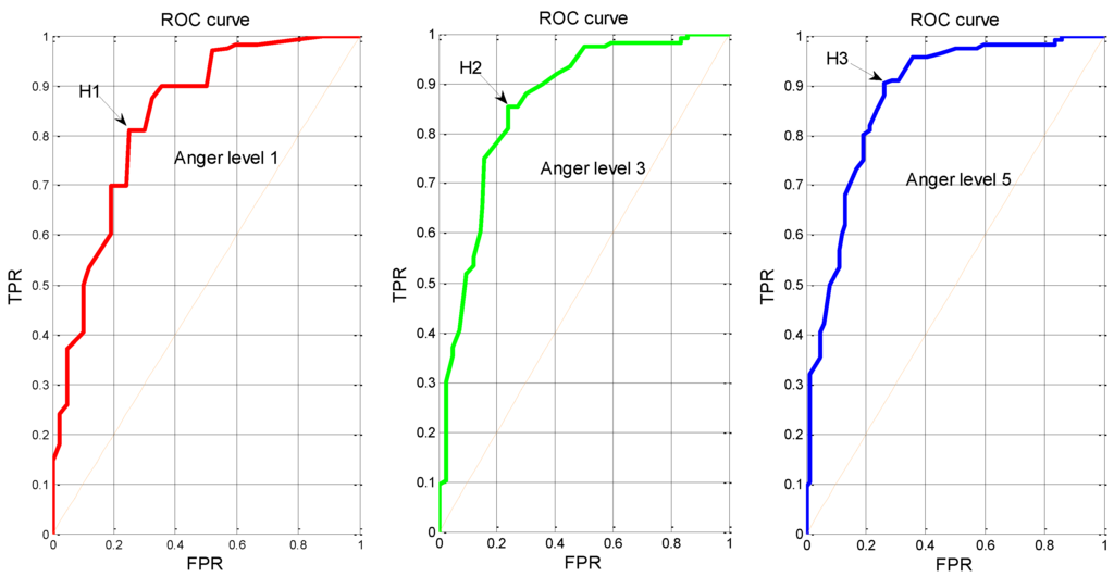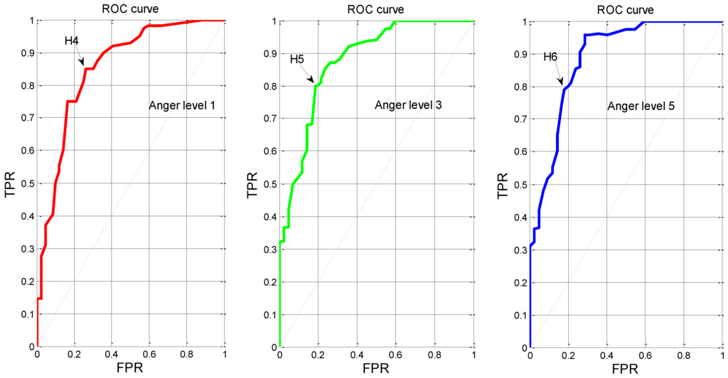 As shown in Figure 8 and Table 3, the best cut-off points for indicator of β% at anger level 1, level 3 and level 5 are H1, H2 and H3, respectively, which are corresponding to an optimal threshold of 0.2586, 0.3269 and 0.3674, respectively. Moreover, the TPRs and FPRs for the three cut-off points belong to the range of [81.03%, 90.52%] and [22.14%, 26.19%], respectively, implying the optimal thresholds have a good accuracy when discriminating different-intensity anger states. Likewise, Figure 9 and Table 3 indicate that the best cut-off points for indicator of θ% at anger level 1, level 3 and level 5 are H4, H5 and H6, respectively, which are corresponding to an optimal threshold of 0.2183, 0.1539 and 0.1216, respectively. Additionally, the TPRs and FPRs for the three cut-off points belong to the range of [75.06%, 80.09%] and [16.52%, 18.64%], respectively, also indicating the optimal thresholds have a good accuracy when discriminating different-intensity anger states.