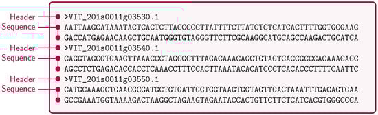 “FASTA” is a text-based format which represents nucleotides or amino acids with single-letter codes [84]. A sequence in this format has two parts: (i) the description, that starts with the “>” symbol; and (ii) the sequence data. The “Multi-FASTA” format, as shown in Figure 1, is the concatenation of different single sequence FASTA files. In this section, several methods for compressing FASTA/Multi-FASTA files are described.