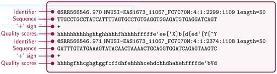 “FASTQ” is a text-based format which represents biological sequences and their corresponding quality scores with ASCII characters. This file format is considered as the de facto standard for storing the output of high-throughput sequencing instruments [100]. A sequence in FASTQ format, as shown in Figure 2, has four parts: (i) the sequence identifier; (ii) the raw sequence letters; (iii) a “+” character, optionally followed by the same sequence identifier; and (iv) the quality scores. The following methods support the compression of FASTQ files.