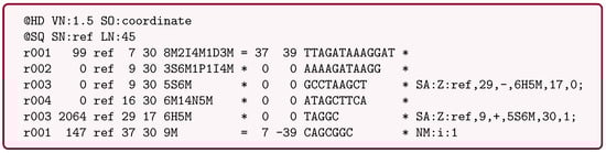 “SAM” (Sequence Alignment/Map) is a text-based format which represents biological sequences that are aligned to a reference sequence. A sequence in SAM format, as shown in Figure 3, contains two parts: (i) the header, that starts with an “@” character; and (ii) the alignment section, that has 11 fields, such as QNAME, CIGAR, SEQ and QUAL. It is worth pointing out that a “BAM” file is the binary version of a SAM file, that is compressed with the BGZF (Blocked GNU Zip Format) tool [3,128,129]. In this section, several methods proposed for compressing the SAM/BAM files are described.