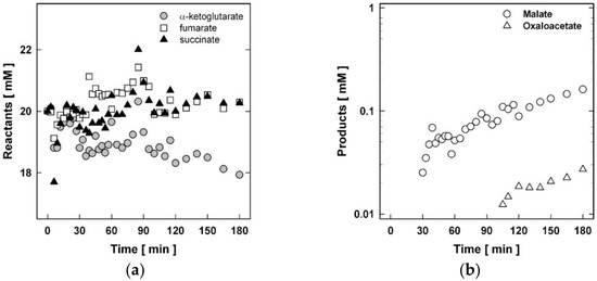Needless to say, the observed synthesis of both malate and oxaloacetate from the initial reactants including α-ketoglutarate, succinate and fumarate may be required to face and overcome a severe criticism raised against it. That is about seeking a countermeasure against arguing for the seemingly thermodynamic unlikelihood of such a synthesis in the first place. The synthesis of oxaloacetate from malate is endergonic with the difference of the Gibbs free energy by the amount of roughly ∆G ≈ 30 kJ/mol. This may imply that the population ratio of oxaloacetate to malate to be estimated thermodynamically at 0 °C, which is simply equated with the dimensionless equilibrium constant in chemical kinetics, could significantly decrease roughly to the order of the Boltzmann factor exp(−∆G/κBT) ≈ 1.82 × 10−6 with T = 273 K, in which κB is the Boltzmann constant. Furthermore, even at an elevated temperature as high as 180 °C near the hot spot inside the flow reactor, the Boltzmann factor exp(−∆G/κBT) ≈ 3.47 × 10−4 with T = 453 K would still remain far less than the actual population ratio of oxaloacetate to malate that was measured to be roughly of the order of 0.1 at about 110 min after the start of the flow reactor operation (see Figure 1b).