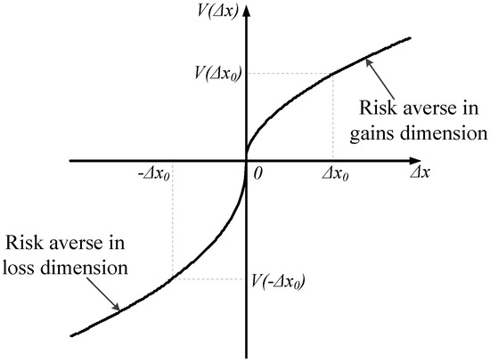 - Reference dependence: the DM normally perceives outcomes as gains or losses relative to a reference point [26]. Correspondingly, the value function is divided into two parts by the reference point, i.e., the gain dimension () and the loss dimension ().