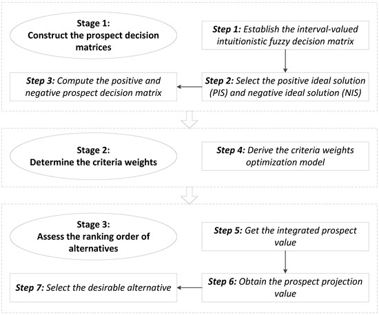 To select the optimal alternative, we propose a novel framework based on prospect theory to solve interval-valued intuitionistic fuzzy MCDM problems with incompletely known or completely unknown weight information. Specifically, the proposed approach comprises three main stages: constructing the prospect decision matrices, determining the weights of criteria, and assessing the ranking order of the alternatives.