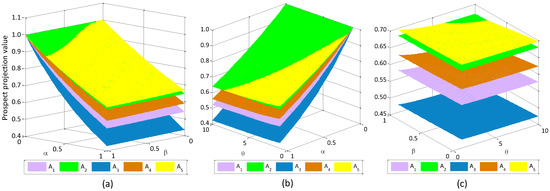 Figure 4 indicates that the prospect projection value of each alternative decreases with the increase of the single parameter , , or . This figure also shows that the optimal alternative shifts with the change of the single parameter , , or to a certain point. For example, the optimal alternative switches from to as the parameter increases to approximately 0.26 (see, Figure 4a), while this change happens as the parameter (resp. ) increases to approximately 0.45 (resp. to approximately 2) (see, Figure 4b,c). In addition, Figure 5 and Table 2 report that the changing of two and three parameters, respectively, also affects the selection of the optimal alternative. For example, Figure 5a shows that if and , the optimal investment alternative is , whereas the optimal investment alternative is as and . We remark that our interval-valued intuitionistic fuzzy MCDM method has practical value because the results shown in Figure 4 and Figure 5 can immediately provide useful advice to the DM.