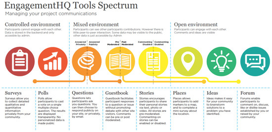 - EngagementHQ: What Tool for What Purpose? Available online: https://bangthetable.zendesk.com/hc/en-us/articles/210563866-What-tool-for-what-purpos (accessed on 28 October 2016).