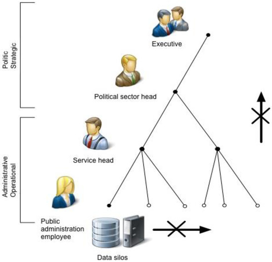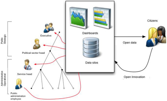 As stated above, in our work we focus on enhancing the transparency and efficiency in Swiss public authorities, by making use of collected data based dashboards. The structure of Swiss public authorities in the current situation can be represented as shown in Figure 3. In this configuration, the different members of the public body at both strategic and operational levels will not share the information. This situation leads to no transparency, subjective viewpoints, “feeling-driven” decision-making, and inefficiency. We propose to make use of dashboards (Figure 4), which will allow different stakeholders to share the same picture of the situation. This sharing will facilitate the dialogue between the different politics party, and it will help the convergence of objectives. In a first phase these dashboards will be available at public authorities to target only the efficiency of internal operations. The actors of these public authorities could then decide to include, for example, these dashboards in the reports presented at the primary assemblies. In a third step, data and dashboards could be offered to citizens before meetings so that they can take full knowledge and better prepare their questions (open data, Figure 4). In a later stage, the citizens would have the means to contribute to the political implementation by taking advantage of the open data in order to propose open innovation services.