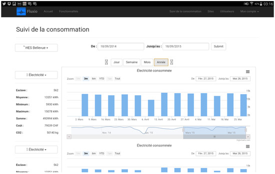 The smart meters are being spread in houses, and clients are being increasingly connected. However, there are currently few tools that grasp the information of these so-called counters, and which offer their consultation over a single platform that puts into perspective real time and multi-fluid energy related data. The “smart metering client” use case (Figure 5) aims to develop an interactive and ergonomic platform available on different devices (PC, Smartphones, Tablets, etc.) for visualizing energy related data. The goal of this platform is to provide monitoring of the consumption and production of several buildings, and several flows: heat, electricity, photovoltaic, water and gas. A responsive website that complies with the requirements has been developed, providing account management, and offering a monitoring of the power consumption of a pilot building over a graph (cf. Figure 6). A system of notifications (e-mail and SMS) is integrated into the site, and a map showing the locations of various buildings (cf. Figure 7).